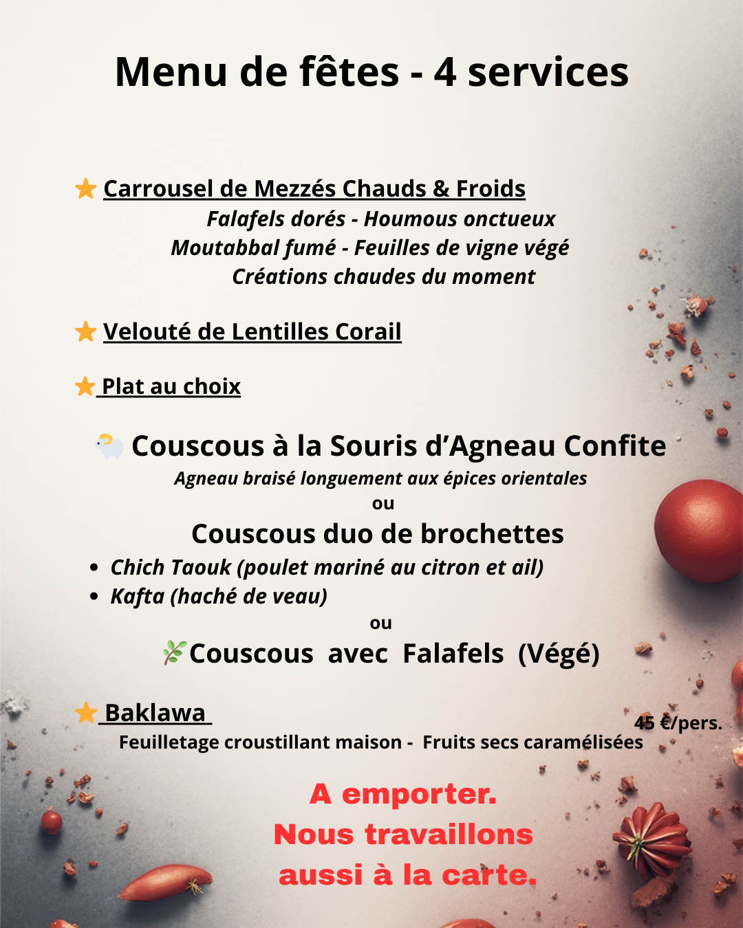 Plongez dans une expérience culinaire authentique. Que vous préfériez une pause sur le pouce avec une commande directe au comptoir ou que vous recherchiez une touche spéciale pour vos événements, notre service traiteur est là pour vous combler. En famille, entre amis, en couple ou en solitaire, nos plats sont conçus pour être dégustés dans une ambiance chaleureuse. "Les Délices du Cèdre", ont la conviction que le rituel du mézzé va bien au-delà de la simple nourriture : il crée des liens uniques entre les convives, nourrissant aussi bien le corps que l’âme. Il transforme chaque repas en une véritable célébration de la vie, de l'amour et de l'amitié.